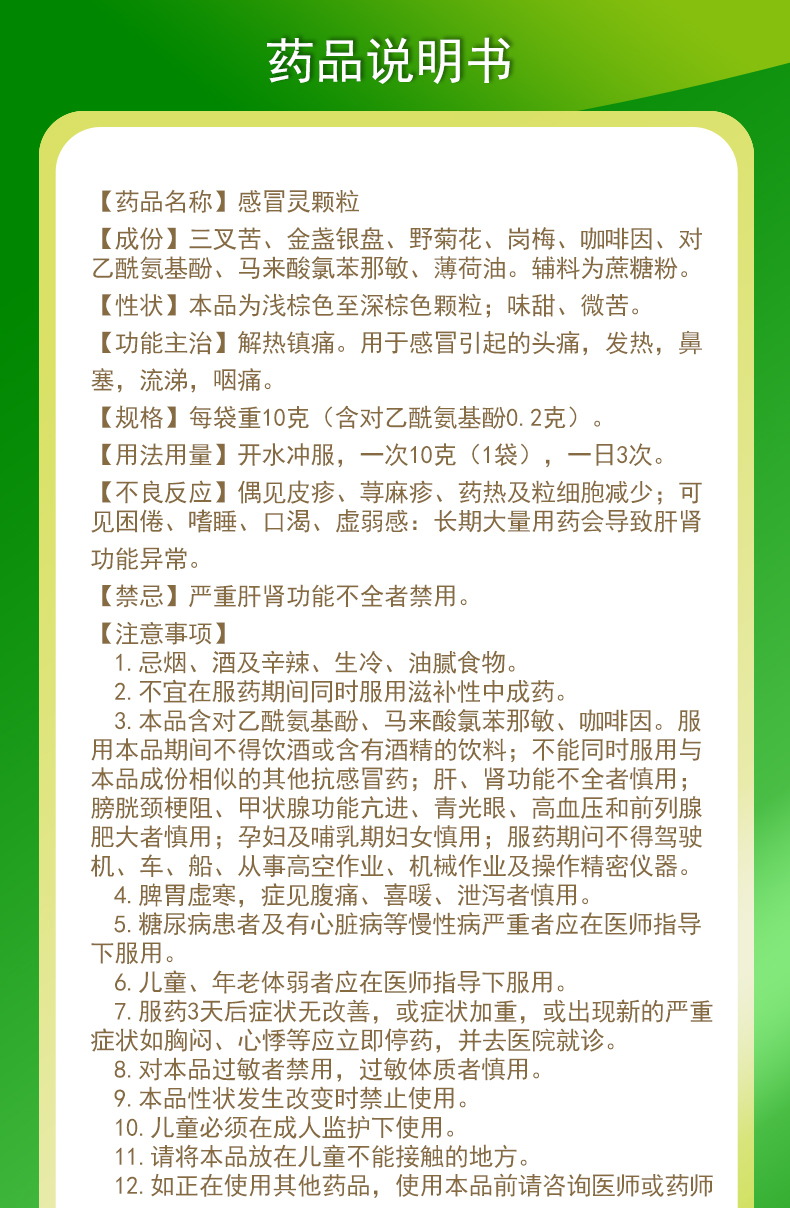 功能主治:解热镇痛。用于感冒引起的头痛,发热,鼻塞,流涕,咽痛。