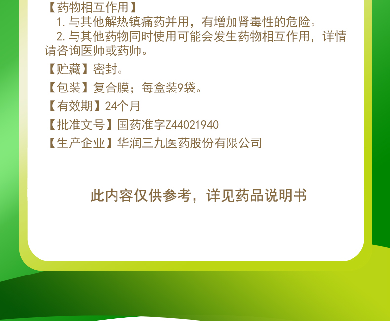 | 套餐类型: 3盒常备装 【感冒咳嗽】感冒 | 生产企业: 华润三九医药股份有限公司 | 规格: 10g*9袋/盒 |