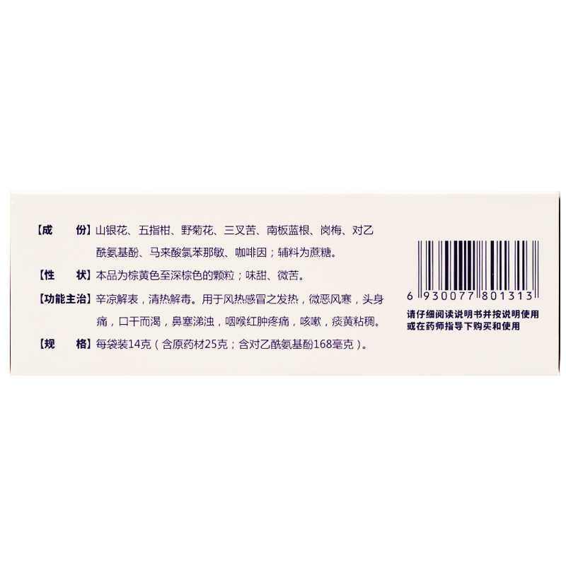 功能主治:辛辣解表,清热解毒。用于风热感冒之发热,微恶风寒,头身痛,口干而渴,鼻塞涕浊,咽喉红肿疼痛,咳嗽,痰黄粘稠。