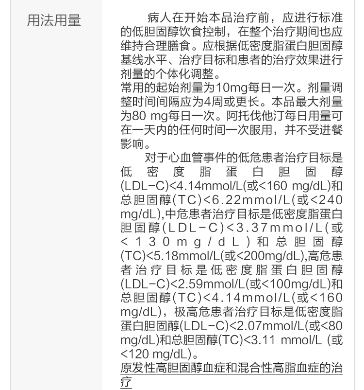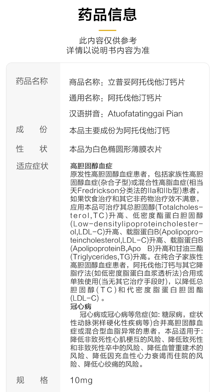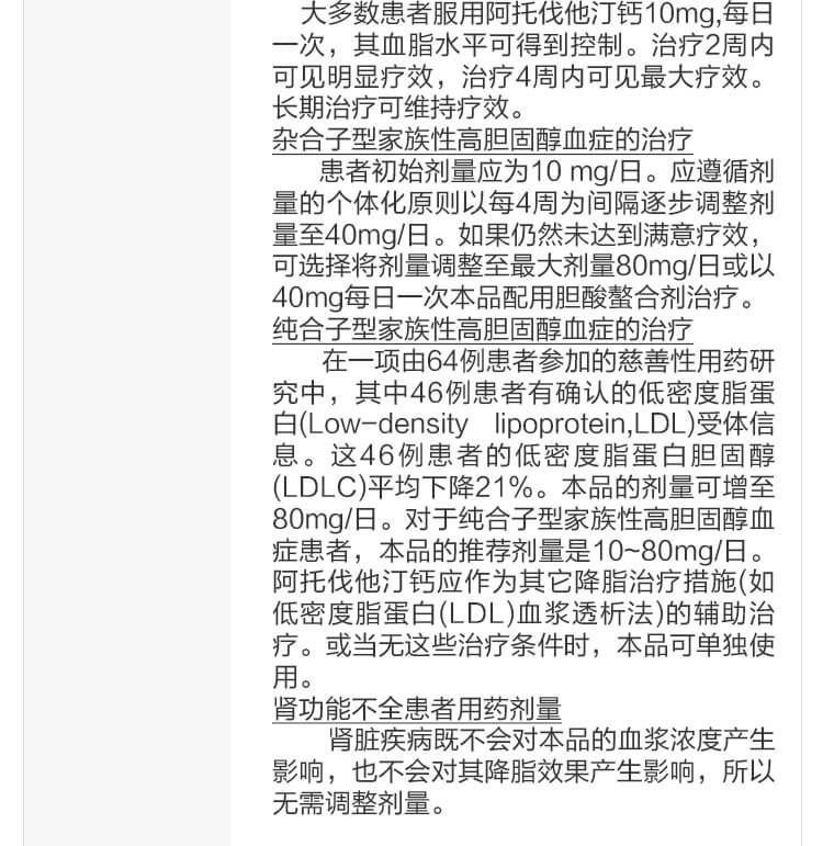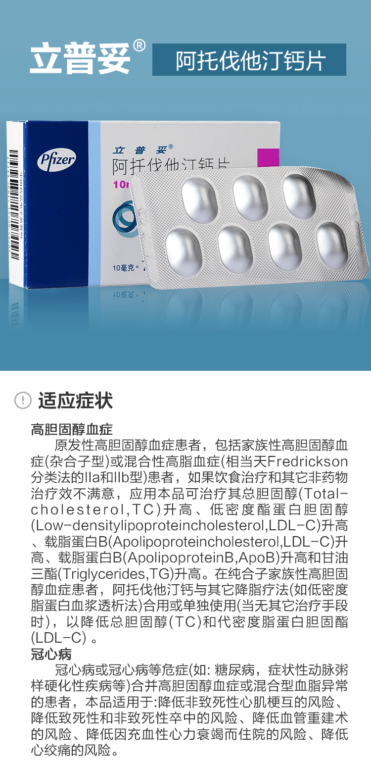 功能主治:高胆固醇血症原发性高胆固醇血症患者,本品适用于:降低非致死性心肌梗死的风险,降低致死性和非致死性卒中的风险、降低血管重建术的风险,降低因充血性心力衰竭而住院的风险,降低心绞痛的风险。