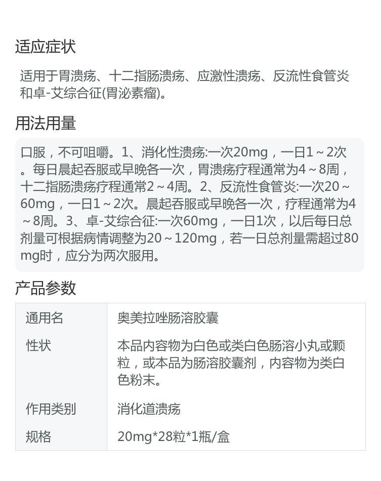 功能主治:适用于胃溃疡、十二指肠溃疡、应激性溃疡、反流性食道炎和卓-艾综合征(胃泌素瘤)。