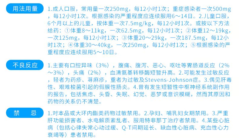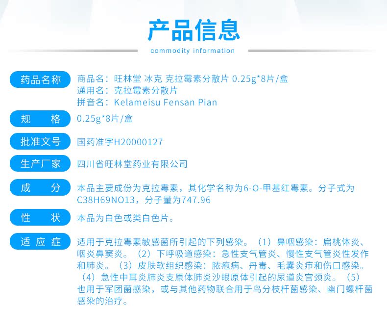 功能主治:适用于克拉霉素敏感菌所引起的下列感染。1、鼻咽感染:扁桃体炎、咽炎、鼻窦炎。2、下呼吸道感染:急性支气管炎、慢性支气管炎急性发作和肺炎。3、皮肤软组织感染